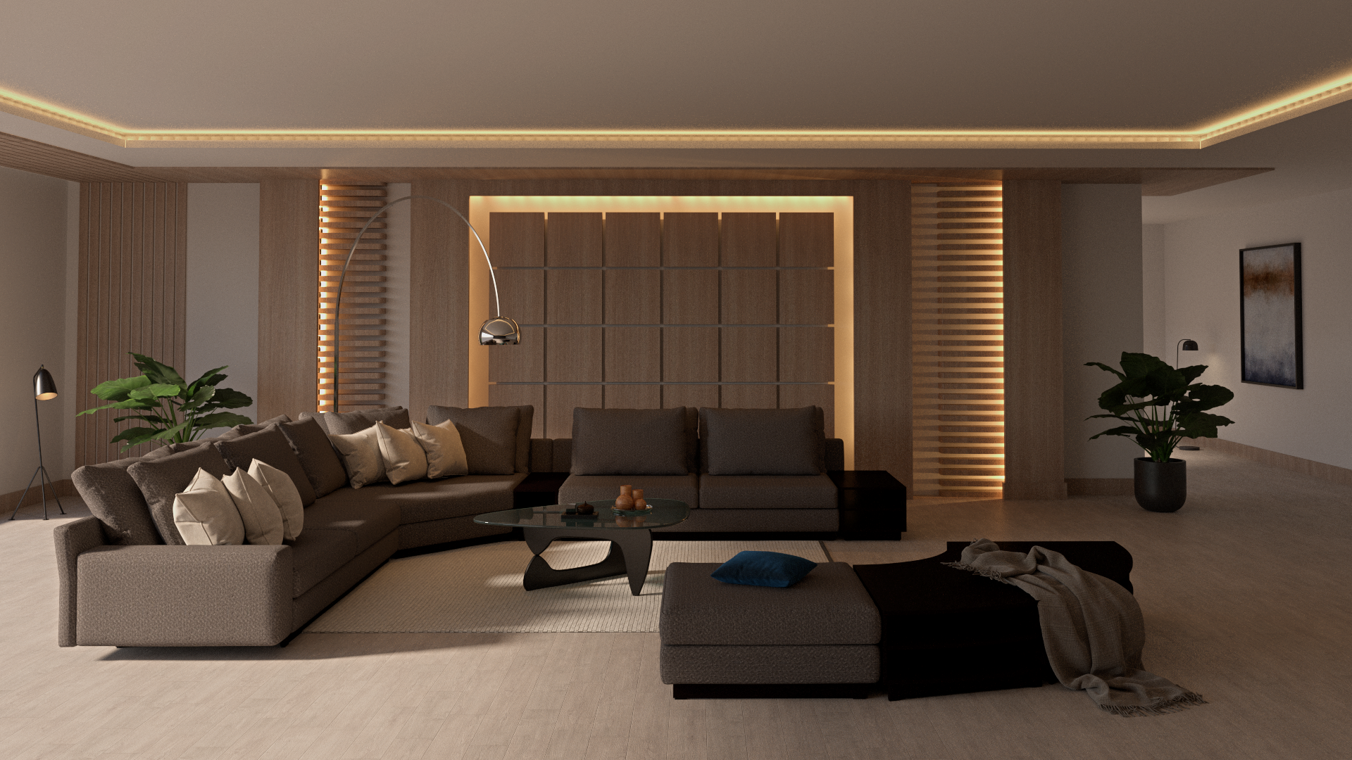 A warm and spacious living room designed with layered lighting and earthy tones. The layout emphasizes comfort and flow, framed by subtle textures and integrated wall lighting.
